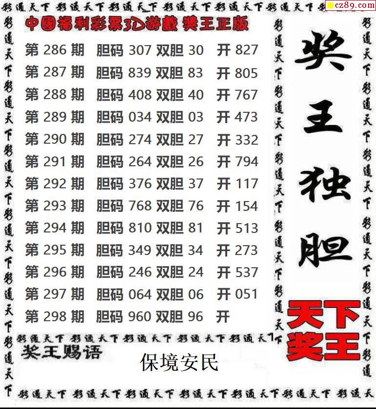 天下奖王2025298期3d图谜